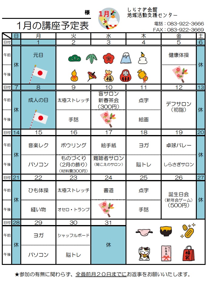 しらさぎ会館地域活動支援センター 1月講座予定