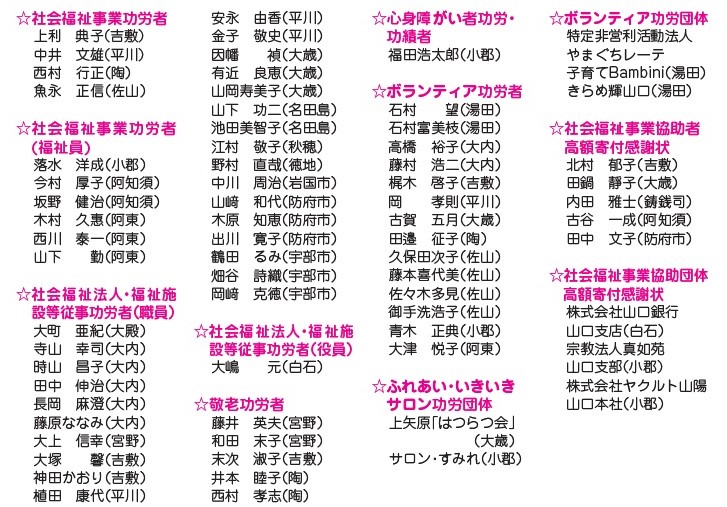 この式では、山口市の福祉の推進のために尽力された皆様のご功績を讃えるとともに、寄附や奉仕活動を通じて福祉の推進に協力された方へ感謝の意を表しました。