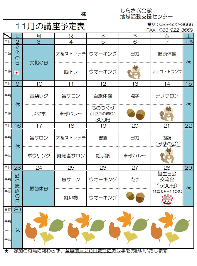 しらさぎ会館地域活動支援センター令和7年11月の講座予定です。 (画像をクリックしていただくとPDFデータで見ることができます。)