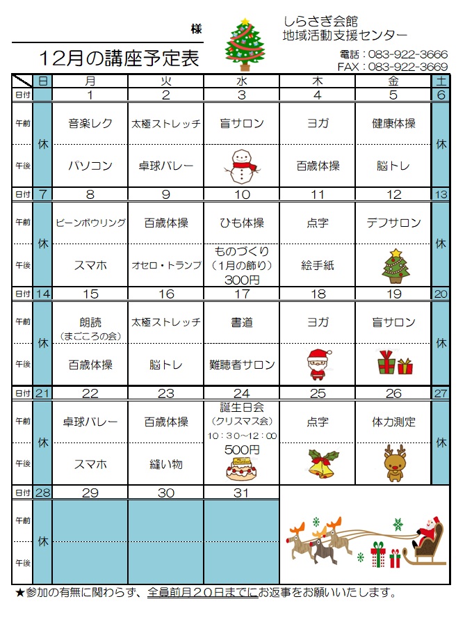 しらさぎ会館地域活動支援センター12月の講座予定