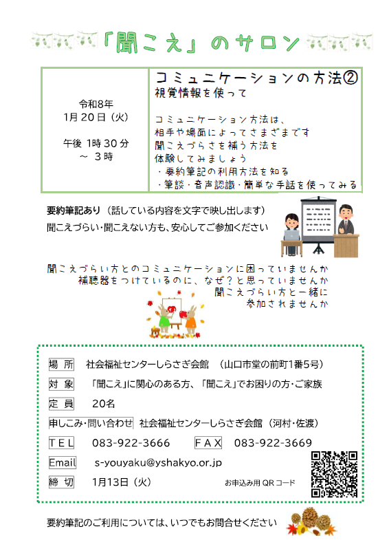 しらさぎ会館 要約筆記担当 TEL 083-922-3666 FAX 083-922-3669 |